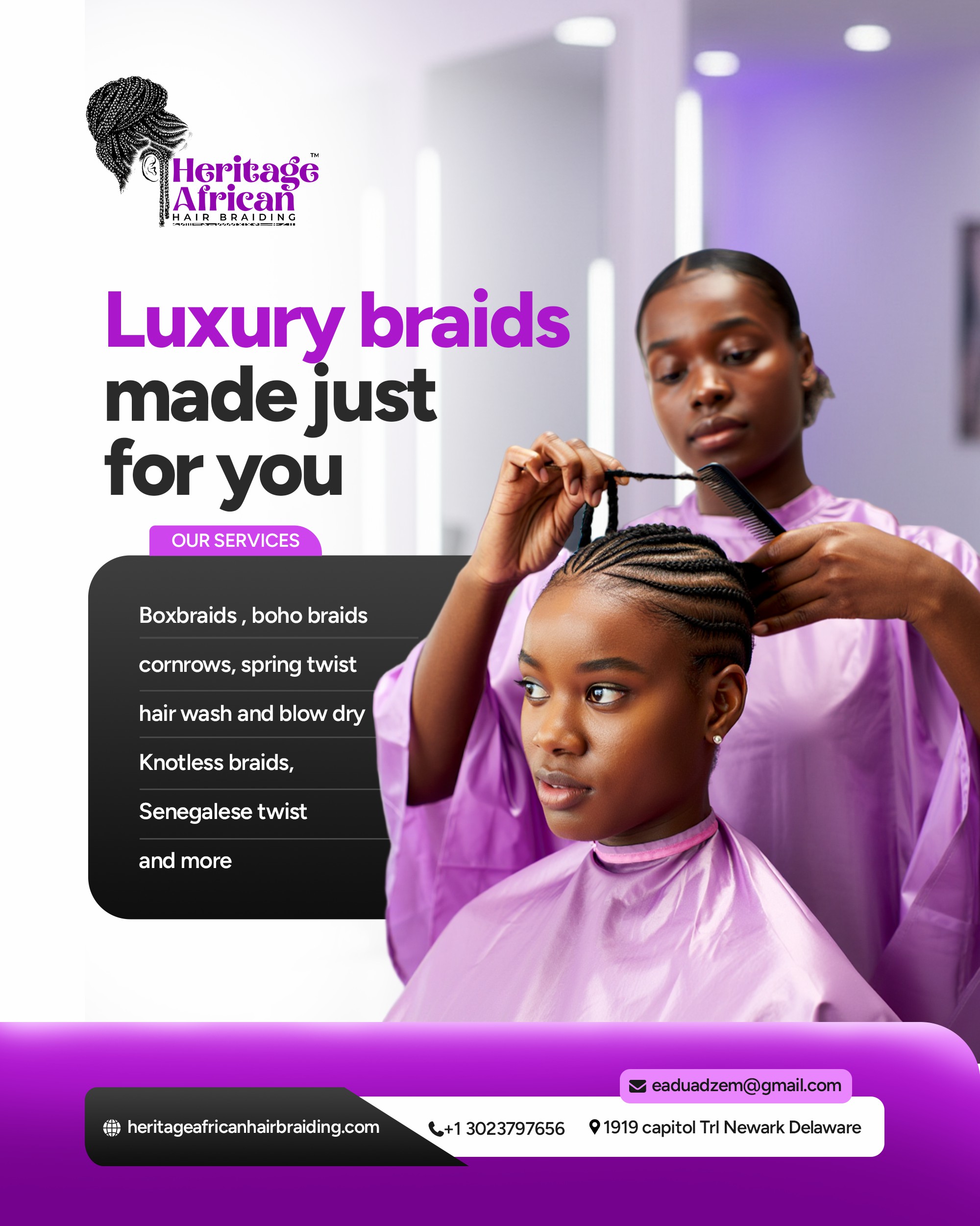 Heritage African Hair Braiding is a professional African hair braiding salon based in Newark, Delaware, offering high-quality, culturally rooted braiding services to clients locally and across the United States. We specialize in protective African hairstyles that combine traditional craftsmanship with modern styling standards.