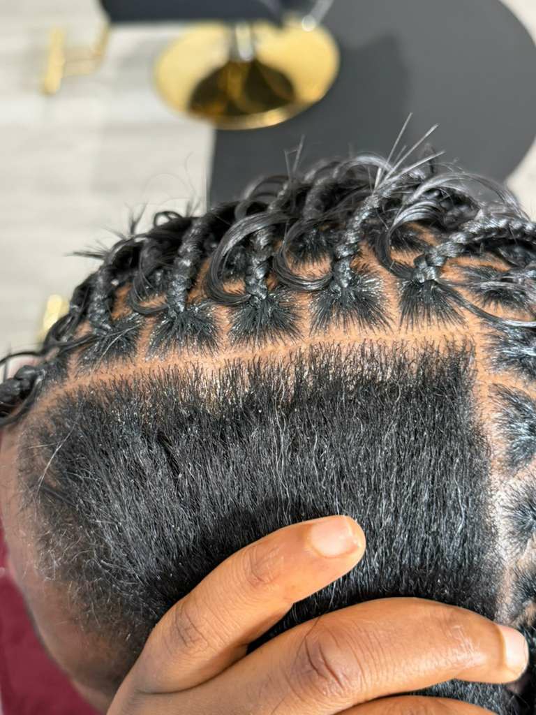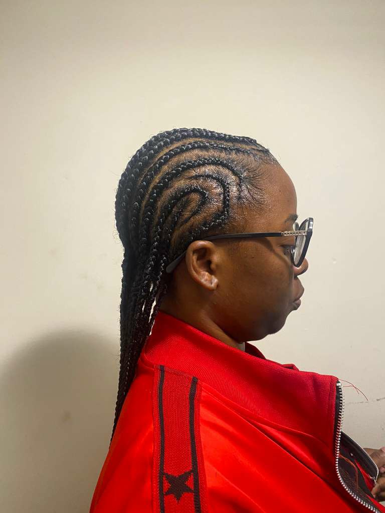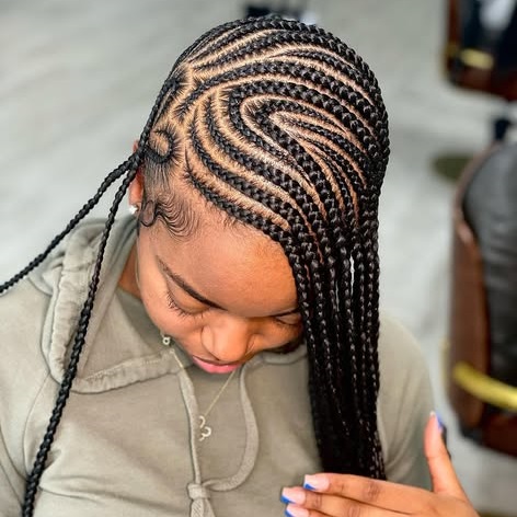 A stylish mix of knotless braids and feed-in braiding, providing a seamless and unique protective style.